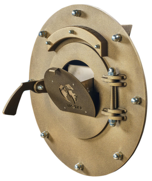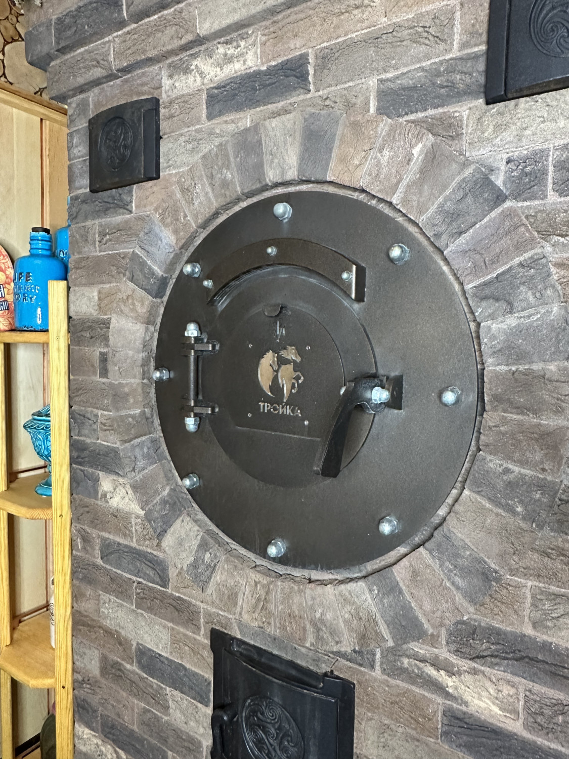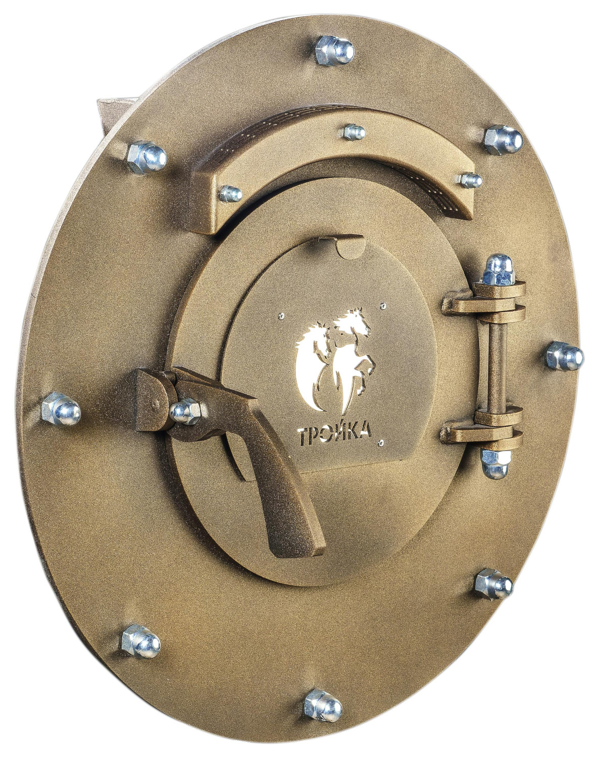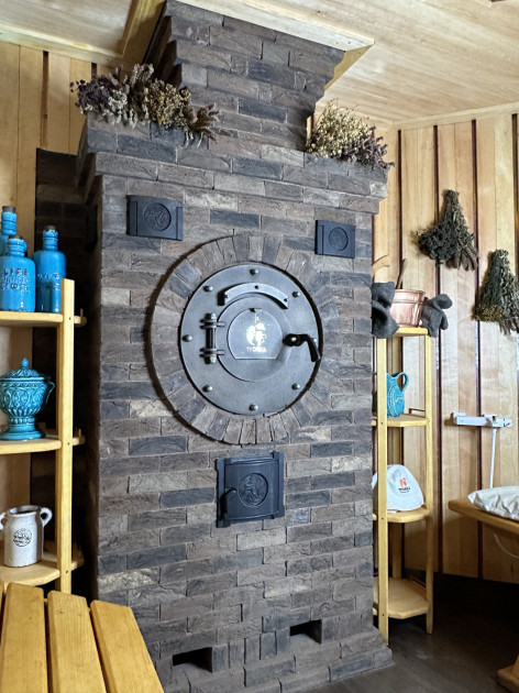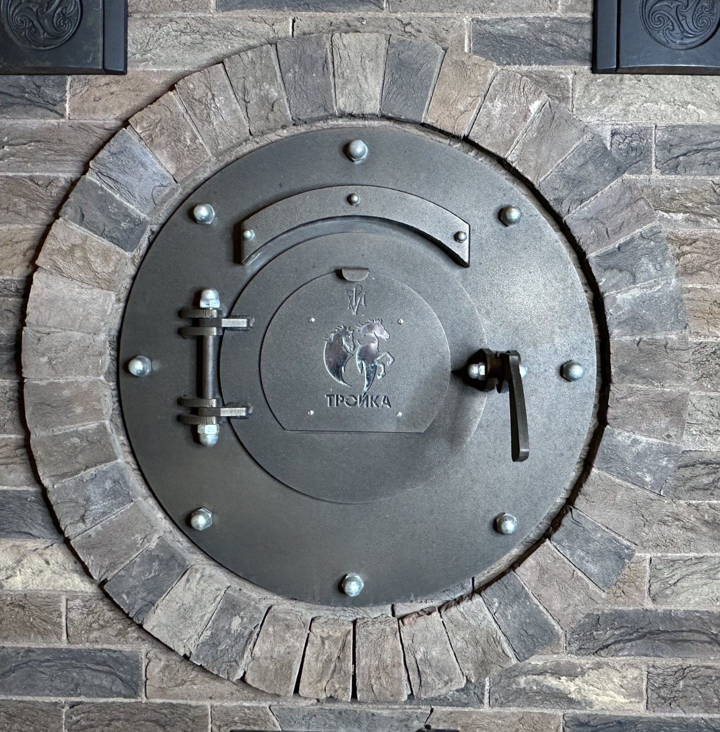 Стальная дверка каменки с откидной воронкой для получения пара без необходимости открывания дверцы.