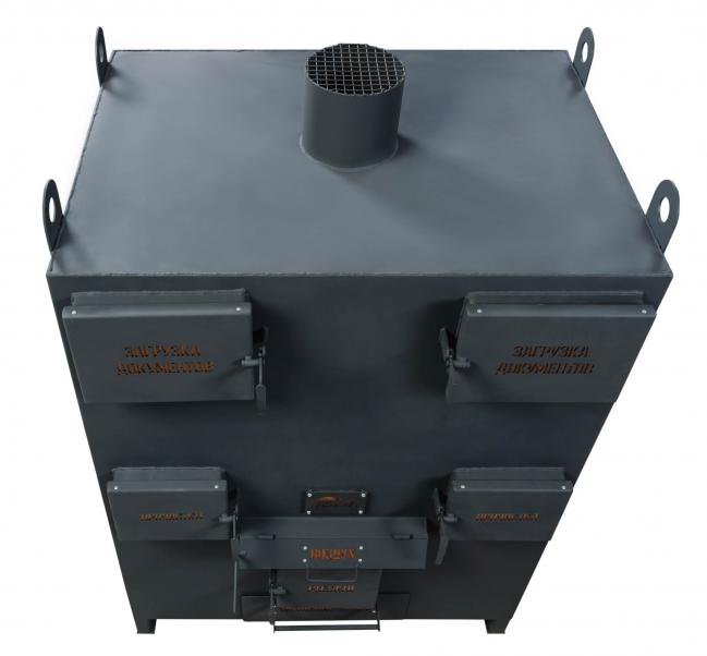 Печь снабжена основной дверцей загрузки документов расположенной в верхней части корпуса и нижней дверцей загрузки топлива для розжига.