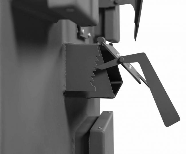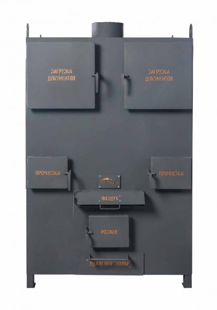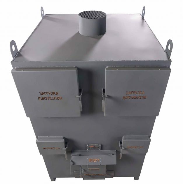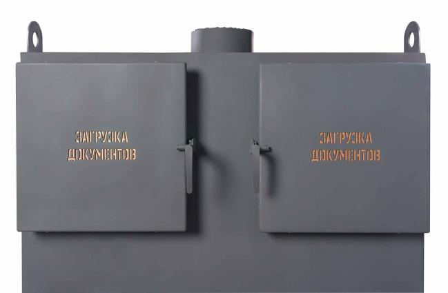 Печь снабжена основными дверцами загрузки документов расположенных в верхней части корпуса и нижней дверцей загрузки топлива для розжига. Размер проема верхних загрузочных дверей составляет 470х470мм, что позволяет загружать документы в мешках.