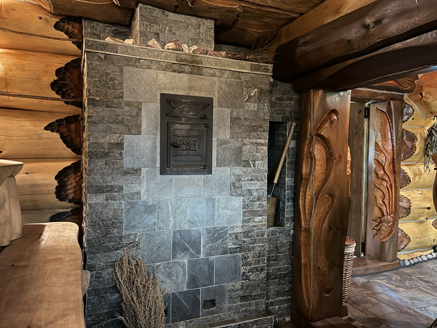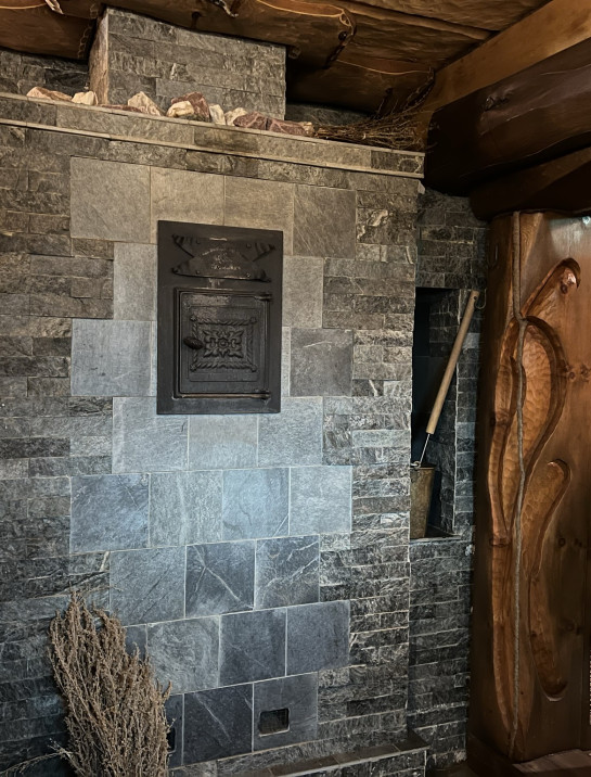 Топка печи распологается в комнате отдыха и может быть декорирована под камин.